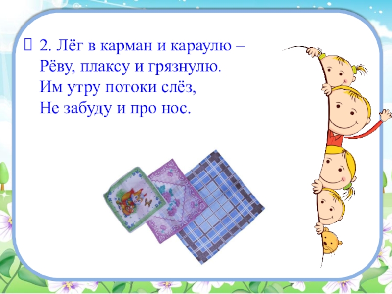 2. Лёг в карман и караулю –  Рёву, плаксу и грязнулю. Им утру потоки слёз,  Не забуду
