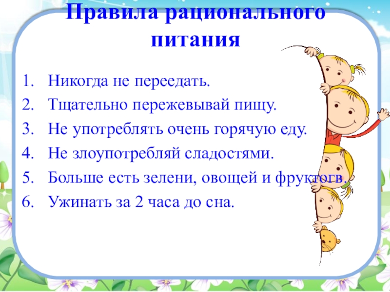 Правила рационального питанияНикогда не переедать.Тщательно пережевывай пищу.Не употреблять очень горячую еду.Не злоупотребляй сладостями.Больше есть зелени, овощей и
