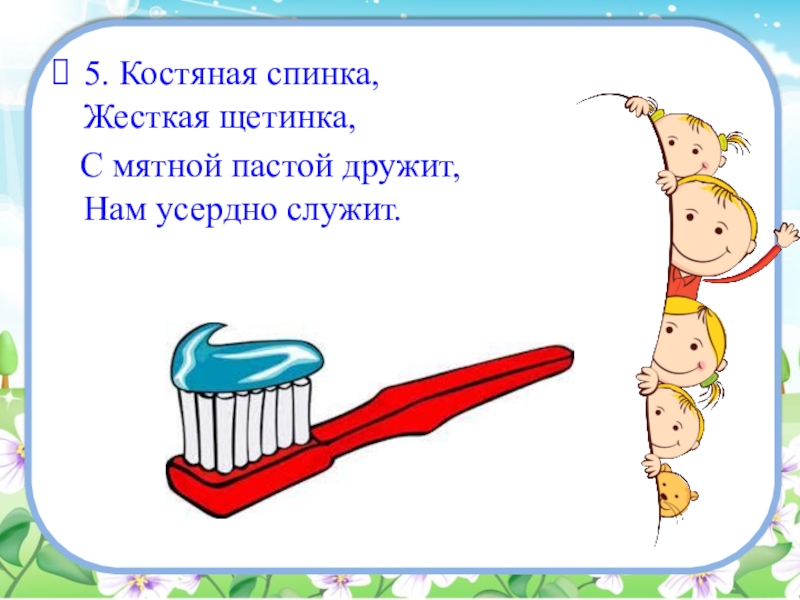 5. Костяная спинка,  Жесткая щетинка,   С мятной пастой дружит,  Нам усердно служит.