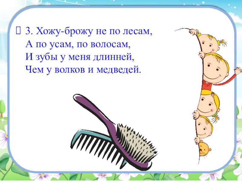 3. Хожу-брожу не по лесам, А по усам, по волосам, И зубы у меня длинней,  Чем у