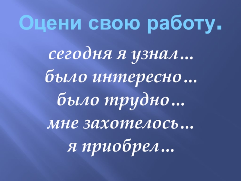 Оцени свою работу.сегодня я узнал…было интересно…было трудно…мне захотелось…я приобрел…
