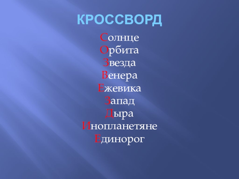 КРОССВОРДСолнцеОрбитаЗвездаВенераЕжевикаЗападДыраИнопланетянеЕдинорог