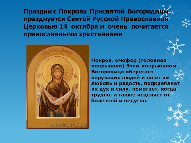 Праздник Покрова Пресвятой Богородицы празднуется Святой Русской Православной Церковью 14 октября и очень почитается православными христианами