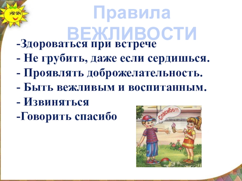 Правила ВЕЖЛИВОСТИ-Здороваться при встрече  - Не грубить, даже если сердишься.  - Проявлять доброжелательность.  - Быть вежливым и