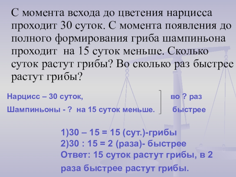 Ответ: 15 суток растут грибы, в 2 раза быстрее растут грибы.