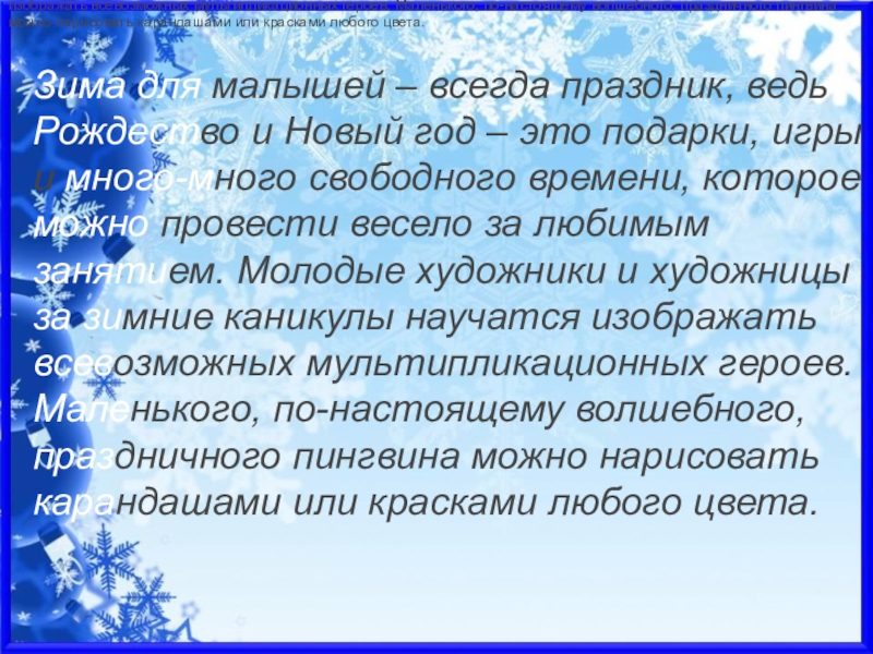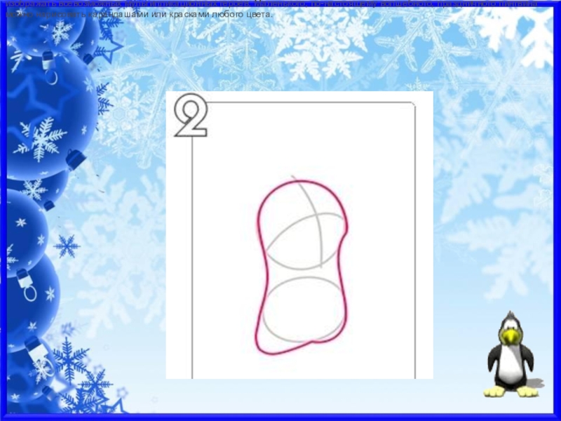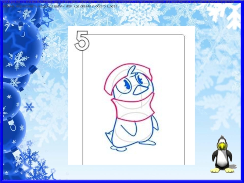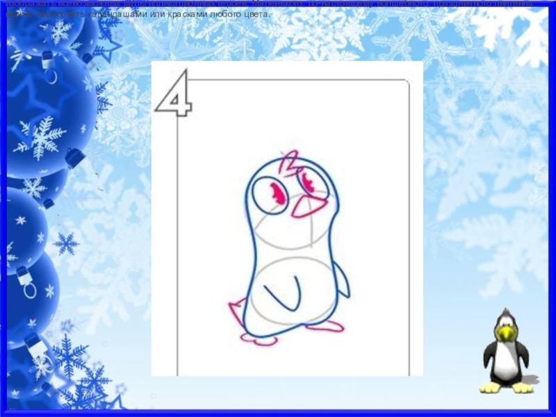 Зима для малышей – всегда праздник, ведь Рождество и Новый год – это подарки, игры и много-много свободного времени, которое можно провести весело за любимым занятием. Молодые художники и художницы за зимние каникулы научатся изображать всевозможных мультипликационных героев. Маленького, по-настоящему волшебного, праздничного пингвина можно нарисовать карандашами или красками любого цвета.