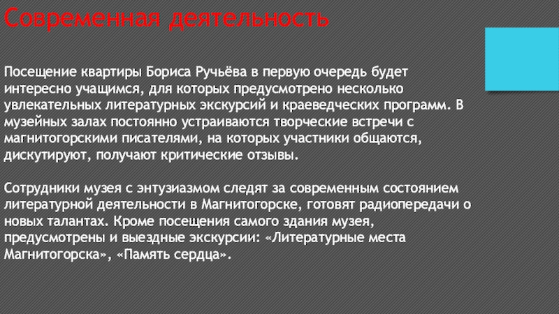 Современная деятельностьПосещение квартиры Бориса Ручьёва в первую очередь будет интересно учащимся, для которых предусмотрено несколько увлекательных литературных