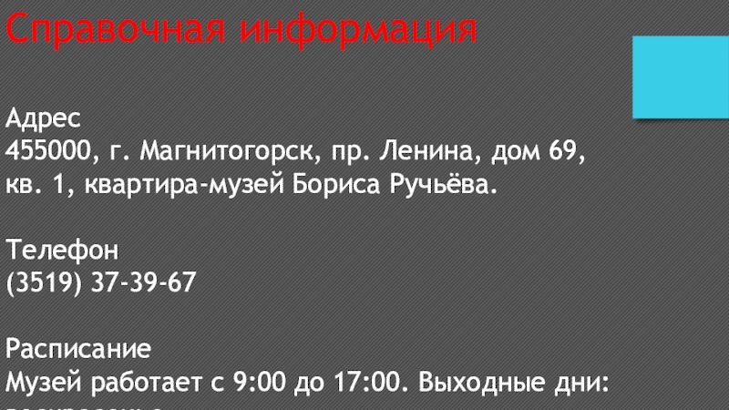 Справочная информацияАдрес455000, г. Магнитогорск, пр. Ленина, дом 69, кв. 1, квартира-музей Бориса Ручьёва.Телефон(3519) 37-39-67РасписаниеМузей работает с 9:00
