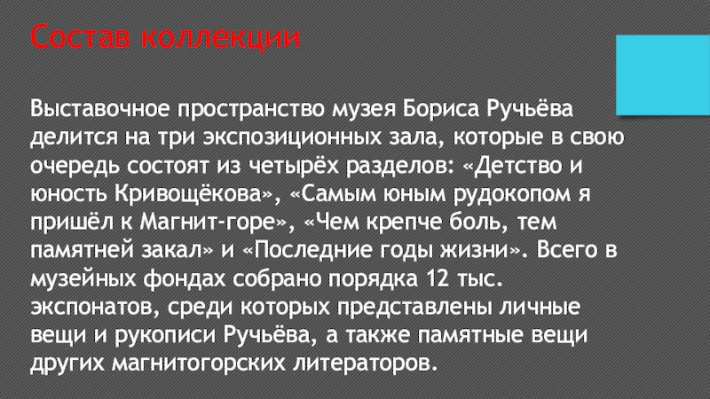 музея. Содержит экспозиции, посвящённые жизни и творчеству Б. Ручьёва, а также истории и сегодняшнему дню литературной жизни г. Магнитогорска. Мемориальный литературный музей был основан в 1975 г. в доме, в котором поэт поселился в 1960 г., когда он был реабилитирован после гулаговской ссылки. В гостях у Бориса Александровича часто собирались представители литературной жизни Урала. В этом доме писатель окончил поэму "Любава" - свое главное произведение, за которое был удостоен государственной премии.Инициаторами создания музея Ручьева стали вдова поэта и его товарищ. Они передали музею личные вещи, рукописи и часть личной библиотеки поэта. Сейчас в музее кроме основной экспозиции, посвященной жизни и творчеству Б.А. Ручьева, можно увидеть и другие коллекции, рассказывающие о судьбах репрессированных писателей и о литературной эпохе Ручьева вообще.