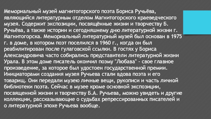 Слайд 2Мемориальный музей магнитогорского поэта Бориса Ручьёва, являющийся литературным отделом Магнитогорского краеведческого