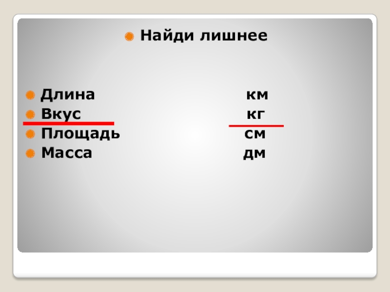 Найди лишнееДлина кмВкус кгПлощадь
