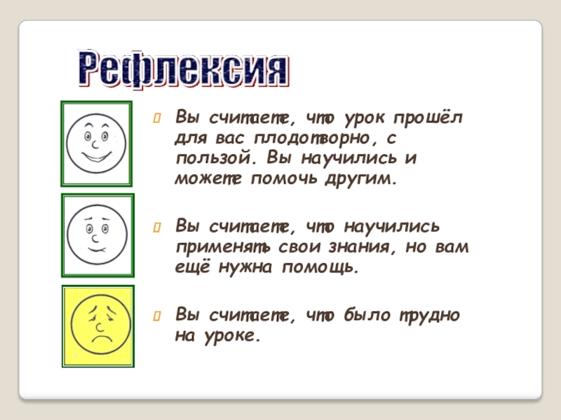 Вы считаете, что урок прошёл для вас плодотворно, с пользой. Вы научились и можете помочь другим.Вы считаете,