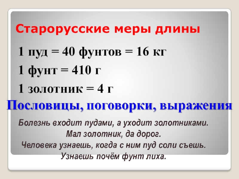 Старорусские меры длины1 пуд = 40 фунтов = 16 кг1 фунт = 410 г1 золотник = 4
