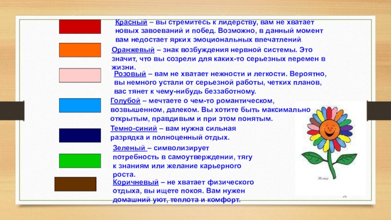 Коричневый – не хватает физического отдыха, вы ищете покоя. Вам нужен домашний уют, теплота и комфорт.
