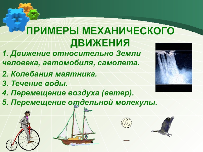 1. Движение относительно Земли человека, автомобиля, самолета.