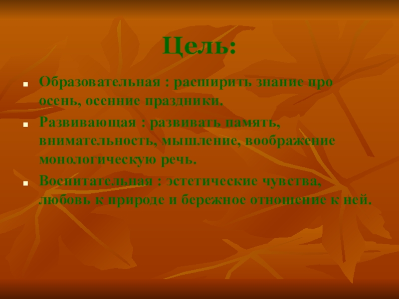 Цель:Образовательная : расширить знание про осень, осенние праздники.Развивающая : развивать память, внимательность, мышление, воображение монологическую речь.Воспитательная : эстетические чувства, любовь к природе и бережное отношение к ней.