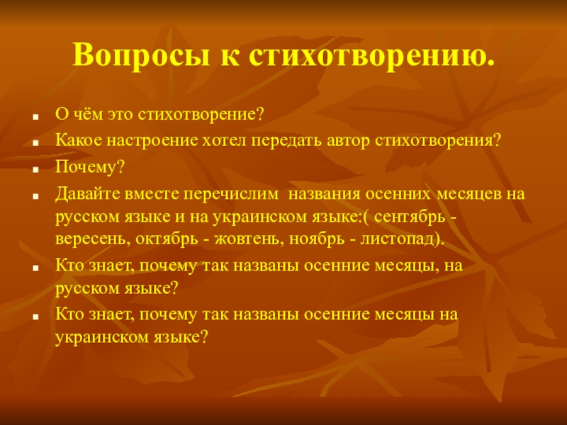 Вопросы к стихотворению.О чём это стихотворение?Какое настроение хотел передать автор стихотворения?Почему?Давайте вместе перечислим названия осенних месяцев на