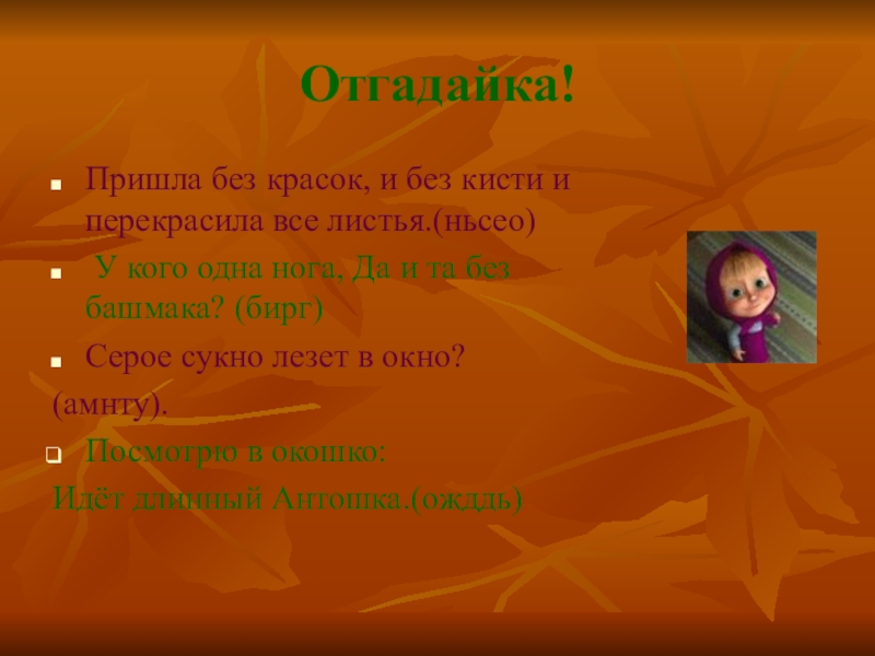 Отгадайка!Пришла без красок, и без кисти и перекрасила все листья.(ньсео) У кого одна нога, Да и та