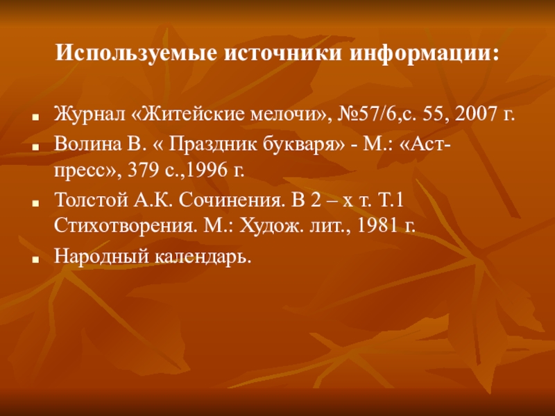 Используемые источники информации: Журнал «Житейские мелочи», №57/6,с. 55, 2007 г.Волина В. « Праздник букваря» - М.: «Аст-