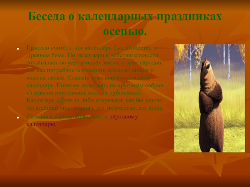 Слайд 7Беседа о календарных праздниках осенью.