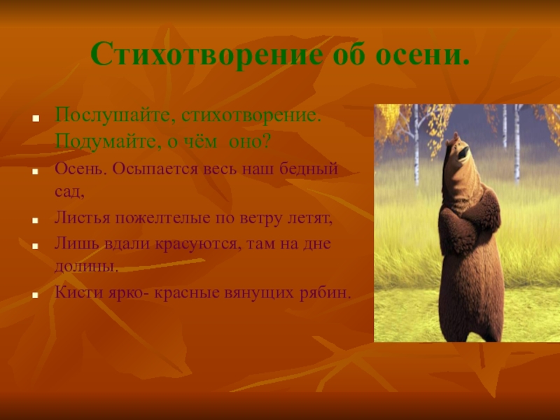 Стихотворение об осени.Послушайте, стихотворение. Подумайте, о чём оно?Осень. Осыпается весь наш бедный сад,Листья пожелтелые по ветру летят,Лишь