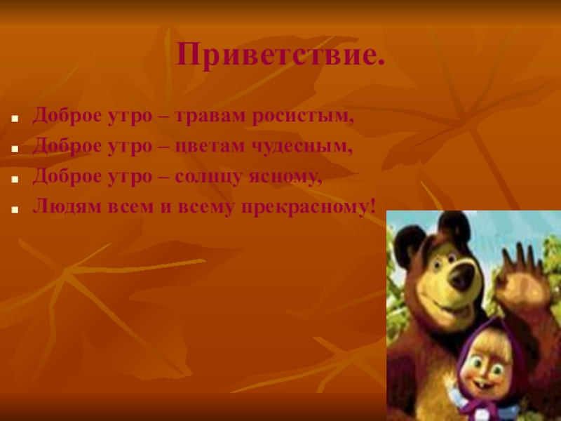 Приветствие.Доброе утро – травам росистым,Доброе утро – цветам чудесным,Доброе утро – солнцу ясному,Людям всем и всему прекрасному!