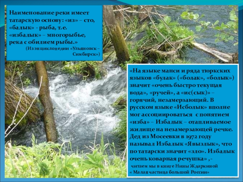 Слайд 7Наименование реки имеет татарскую основу: «из» – сто, «балык» - рыба,
