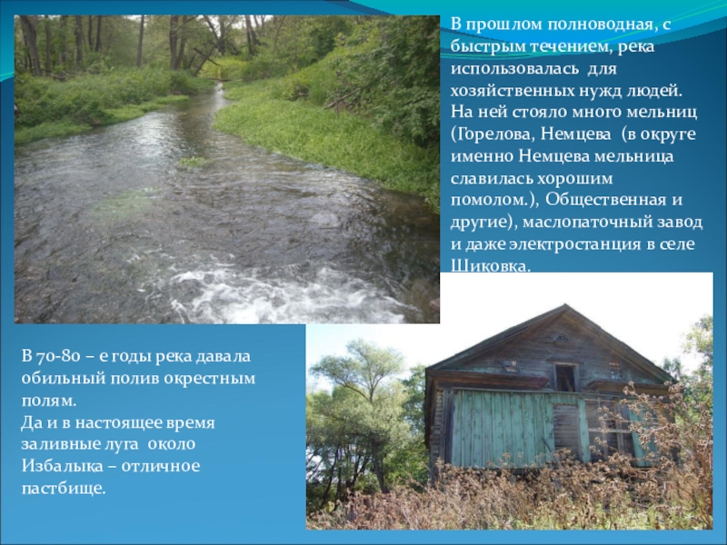Слайд 8В прошлом полноводная, с быстрым течением, река использовалась для хозяйственных нужд
