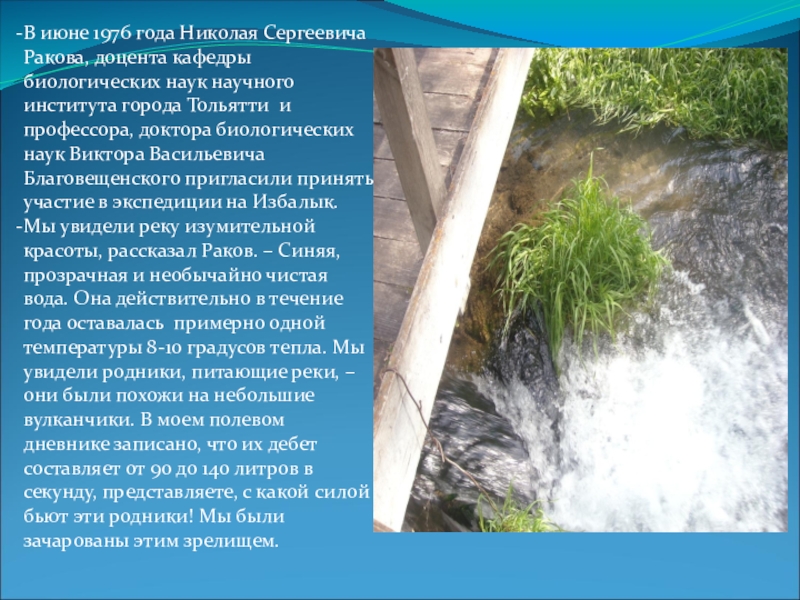 Мы увидели реку изумительной красоты, рассказал Раков. – Синяя, прозрачная и необычайно чистая вода. Она действительно в течение года оставалась примерно одной температуры 8-10 градусов тепла. Мы увидели родники, питающие реки, – они были похожи на небольшие вулканчики. В моем полевом дневнике записано, что их дебет составляет от 90 до 140 литров в секунду, представляете, с какой силой бьют эти родники! Мы были зачарованы этим зрелищем.