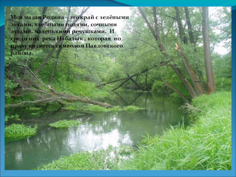 сочными лугами, маленькими речушками. И среди них река Избалык , которая по праву является символом Павловского района.