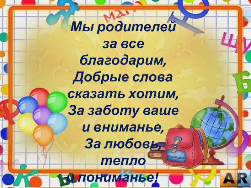 Слайд 16Мы родителей за все благодарим, Добрые слова сказать хотим, За заботу ваше и