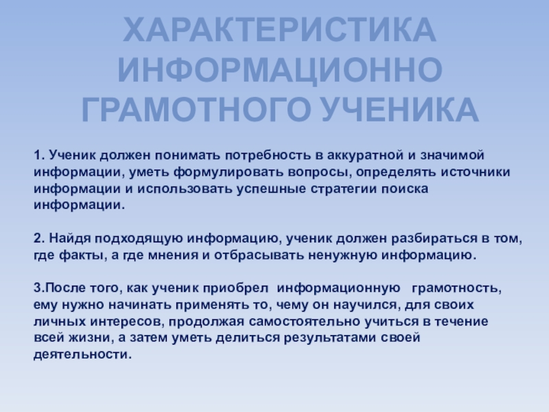 Слайд 5ХАРАКТЕРИСТИКА ИНФОРМАЦИОННО ГРАМОТНОГО УЧЕНИКА