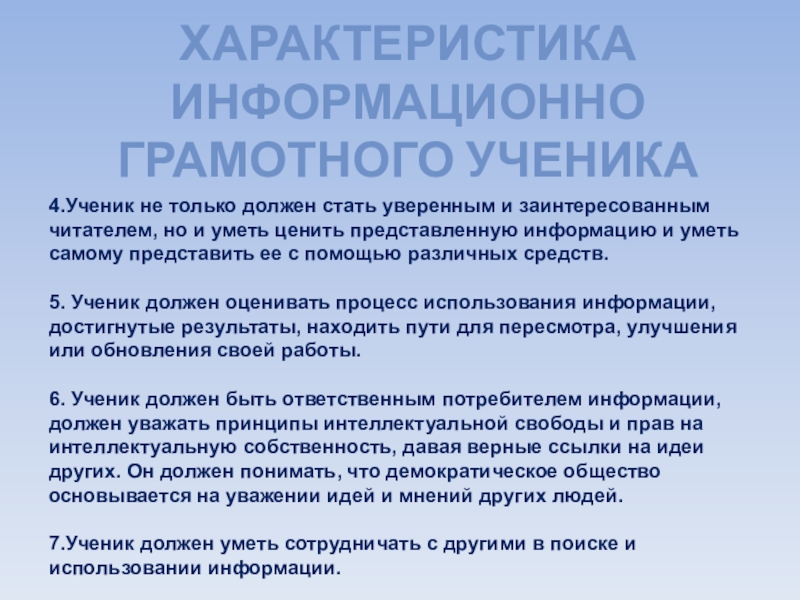 Слайд 4ХАРАКТЕРИСТИКА ИНФОРМАЦИОННО ГРАМОТНОГО УЧЕНИКА