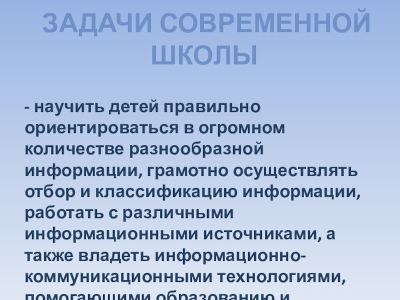 разнообразной информации, грамотно осуществлять отбор и классификацию информации, работать с различными информационными источниками, а также владеть информационно-коммуникационными технологиями, помогающими образованию и самообразованию.
