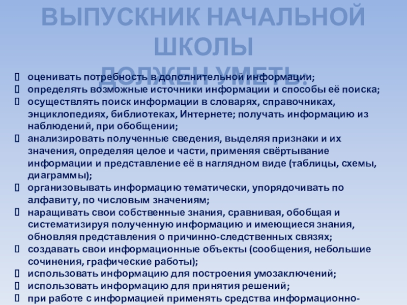 осуществлять поиск информации в словарях, справочниках, энциклопедиях, библиотеках, Интернете; получать информацию из наблюдений, при обобщении;