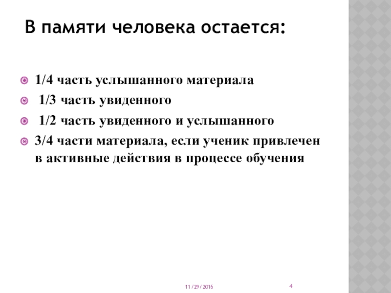 3/4 части материала, если ученик привлечен в активные действия в процессе обучения