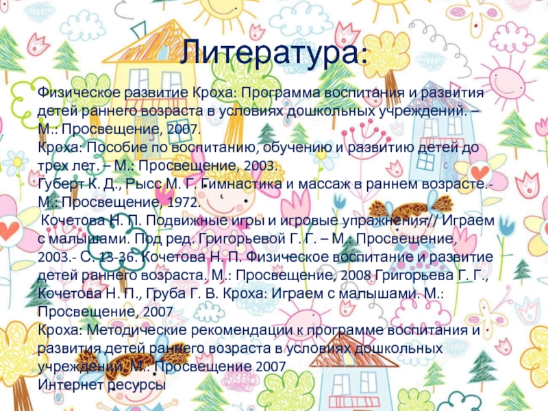 Литература:Физическое развитие Кроха: Программа воспитания и развития детей раннего возраста в условиях дошкольных учреждений. – М.: Просвещение,