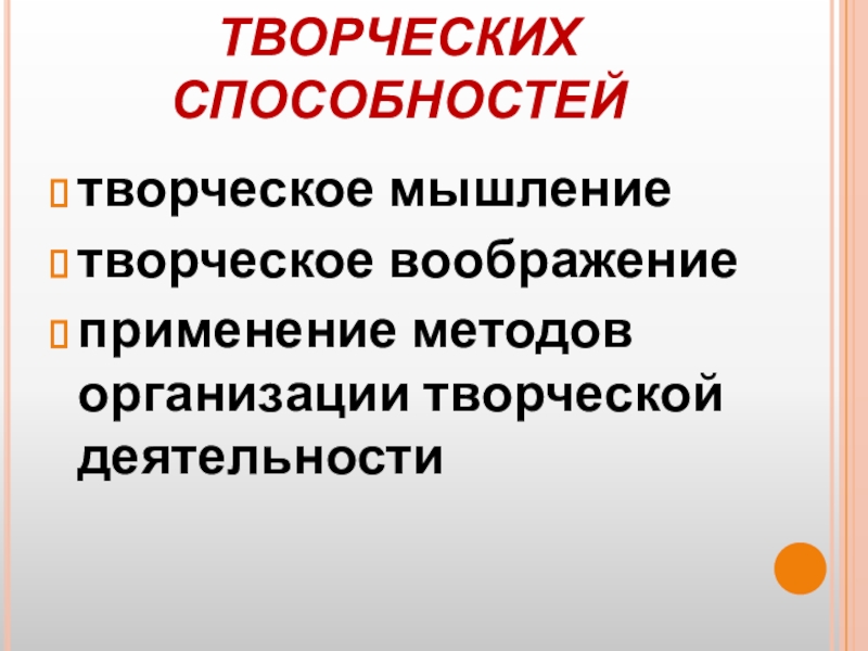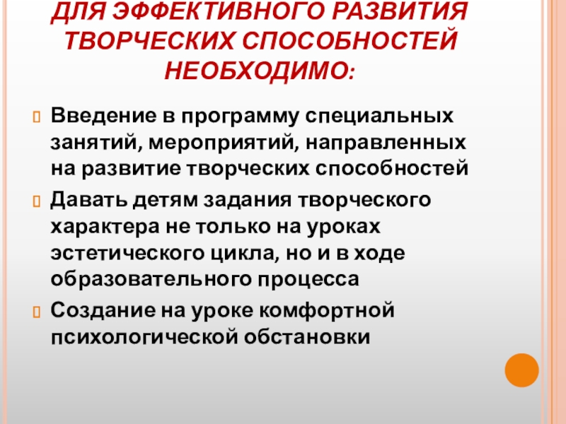 Слайд 15ДЛЯ ЭФФЕКТИВНОГО РАЗВИТИЯ ТВОРЧЕСКИХ СПОСОБНОСТЕЙ НЕОБХОДИМО: