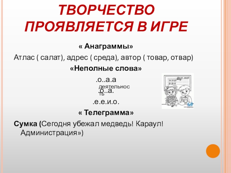 Слайд 10ТВОРЧЕСТВО ПРОЯВЛЯЕТСЯ В ИГРЕ