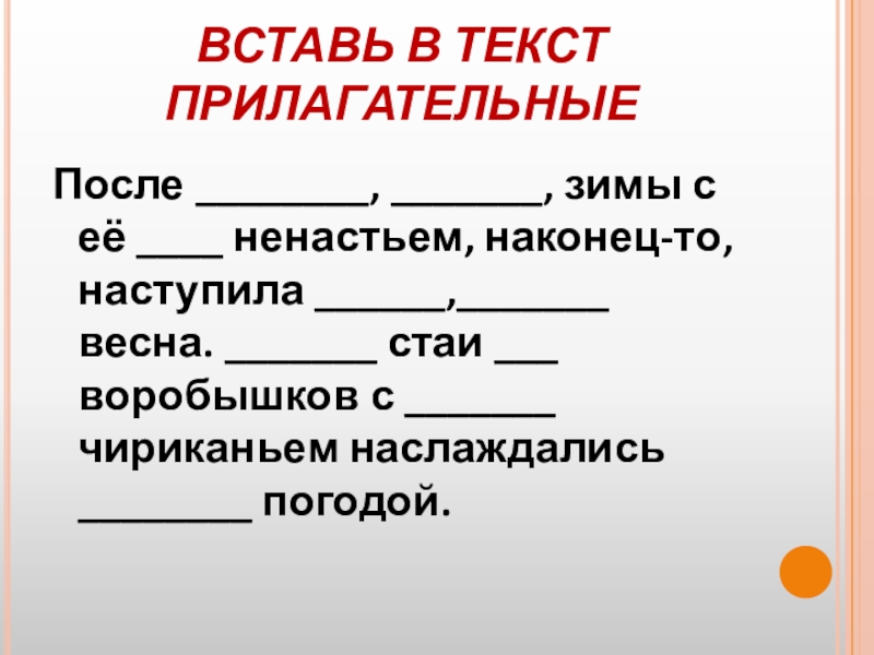 Слайд 12ВСТАВЬ В ТЕКСТ ПРИЛАГАТЕЛЬНЫЕ