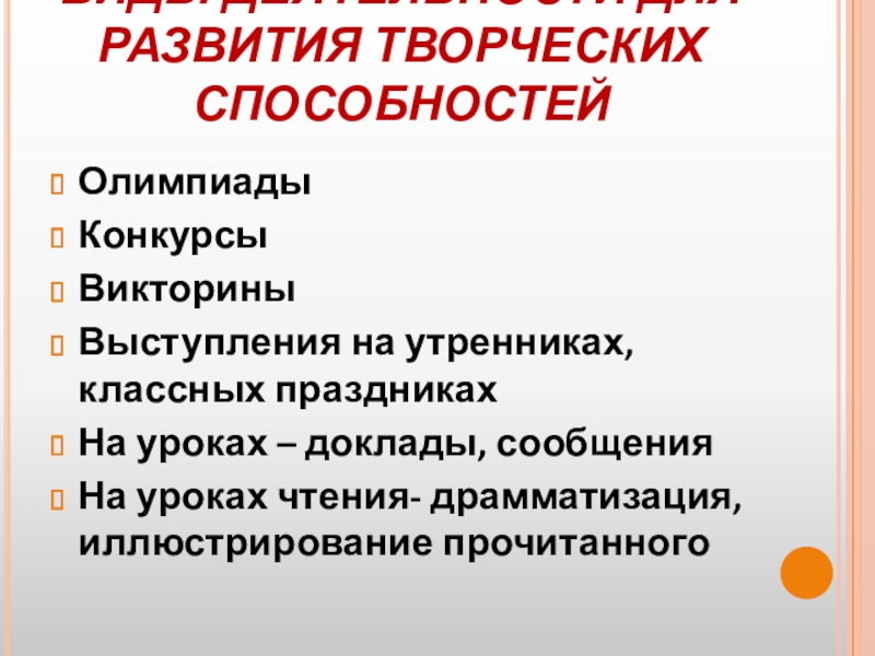 Слайд 14ВИДЫ ДЕЯТЕЛЬНОСТИ ДЛЯ РАЗВИТИЯ ТВОРЧЕСКИХ СПОСОБНОСТЕЙ