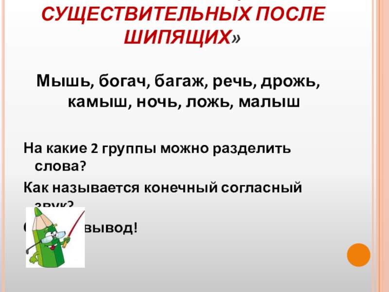 ТЕМА: « Ь НА КОНЦЕ ИМЁН СУЩЕСТВИТЕЛЬНЫХ ПОСЛЕ ШИПЯЩИХ»