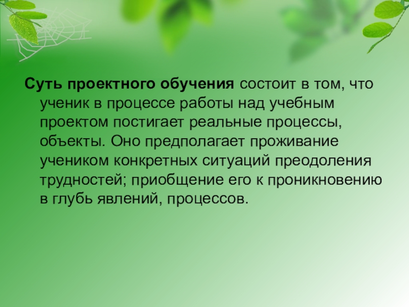 Суть проектного обучения состоит в том, что ученик в процессе работы