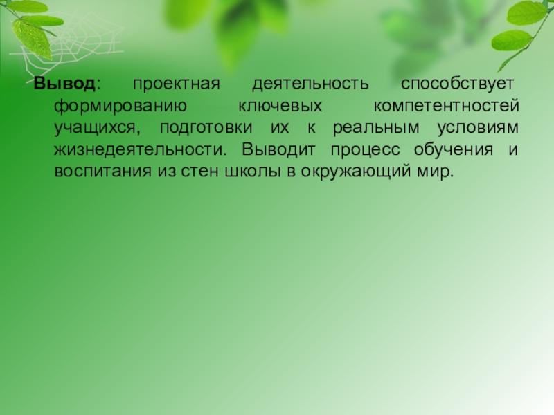 Вывод: проектная деятельность способствует формированию ключевых компетентностей учащихся, подготовки их к
