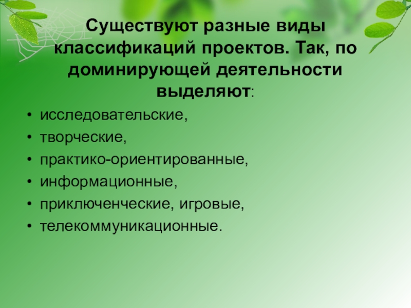 Слайд 4Существуют разные виды классификаций проектов. Так, по доминирующей деятельности выделяют: