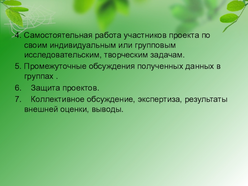 4. Самостоятельная работа участников проекта по своим индивидуальным или групповым исследовательским,