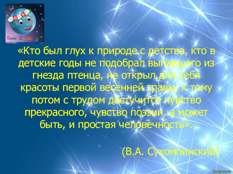 «Кто был глух к природе с детства, кто в детские годы не подобрал выпавшего из гнезда птенца, не открыл для себя красоты первой весенней травы, к тому потом с трудом достучится чувство прекрасного, чувство поэзии, а