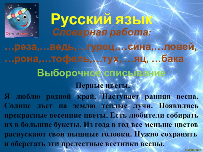 Русский языкСловарная работа:…реза,…ведь,…гурец,…сина,…ловей,…рона,…тофель,…тух, …яц, …бакаВыборочное списываниеПервые цветы.Я люблю родной край. Наступает ранняя весна. Солнце льет на землю