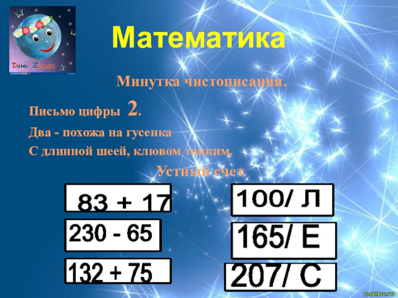 МатематикаМинутка чистописания.Письмо цифры 2.Два - похожа на гусенкаС длинной шеей, клювом тонким.Устный счет.