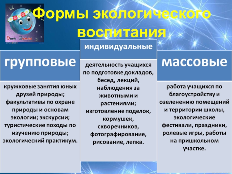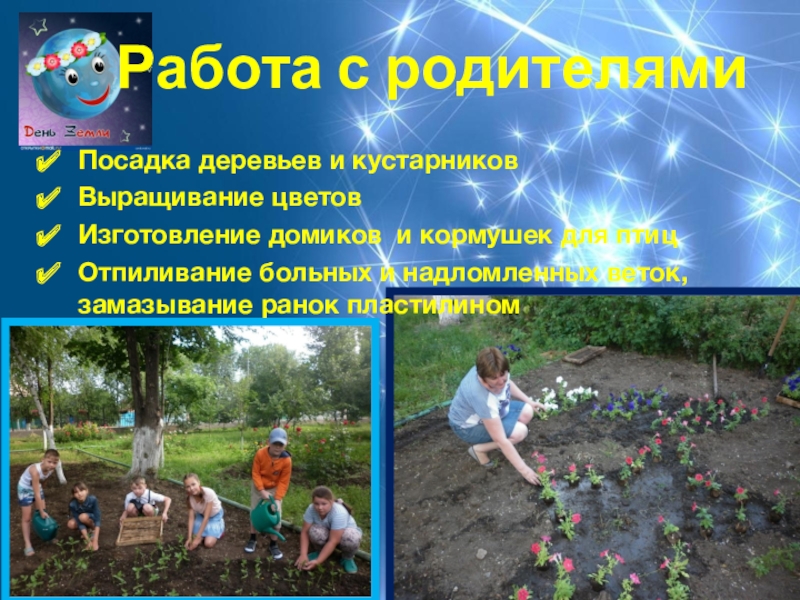 Работа с родителямиПосадка деревьев и кустарниковВыращивание цветовИзготовление домиков и кормушек для птицОтпиливание больных и надломленных веток, замазывание